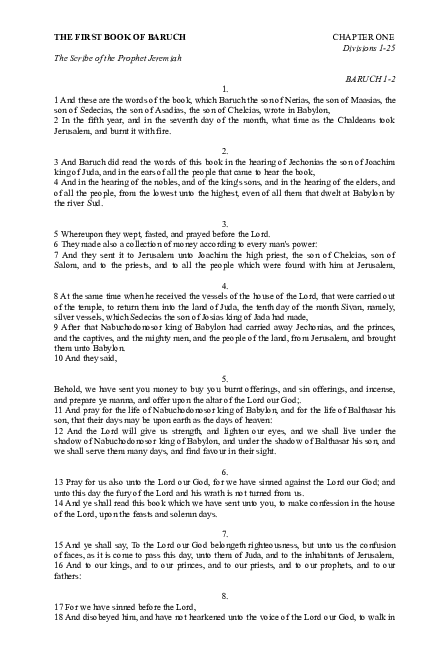 And you shall read this book which we have sent to you to make confession in the house of the Lord upon the day of the feast and on the days of the solemn assembly. Baruch chapter 1 verse 1. 1 Following are the words of the book composed by Baruch son of Neriah son of Mahseiah son of Zedekiah son of Hasadiah son of Hilkiah in.